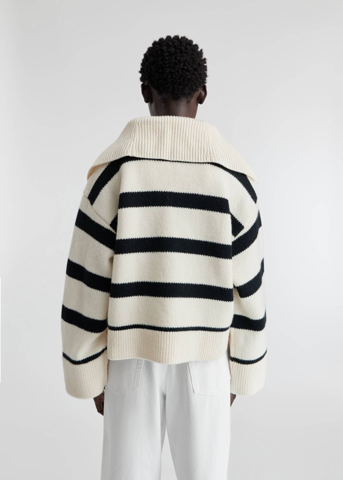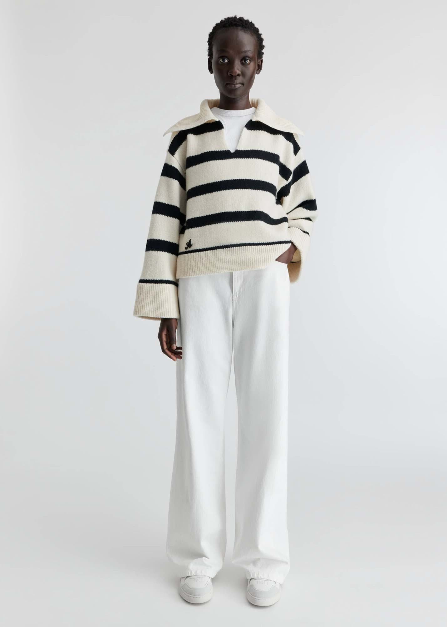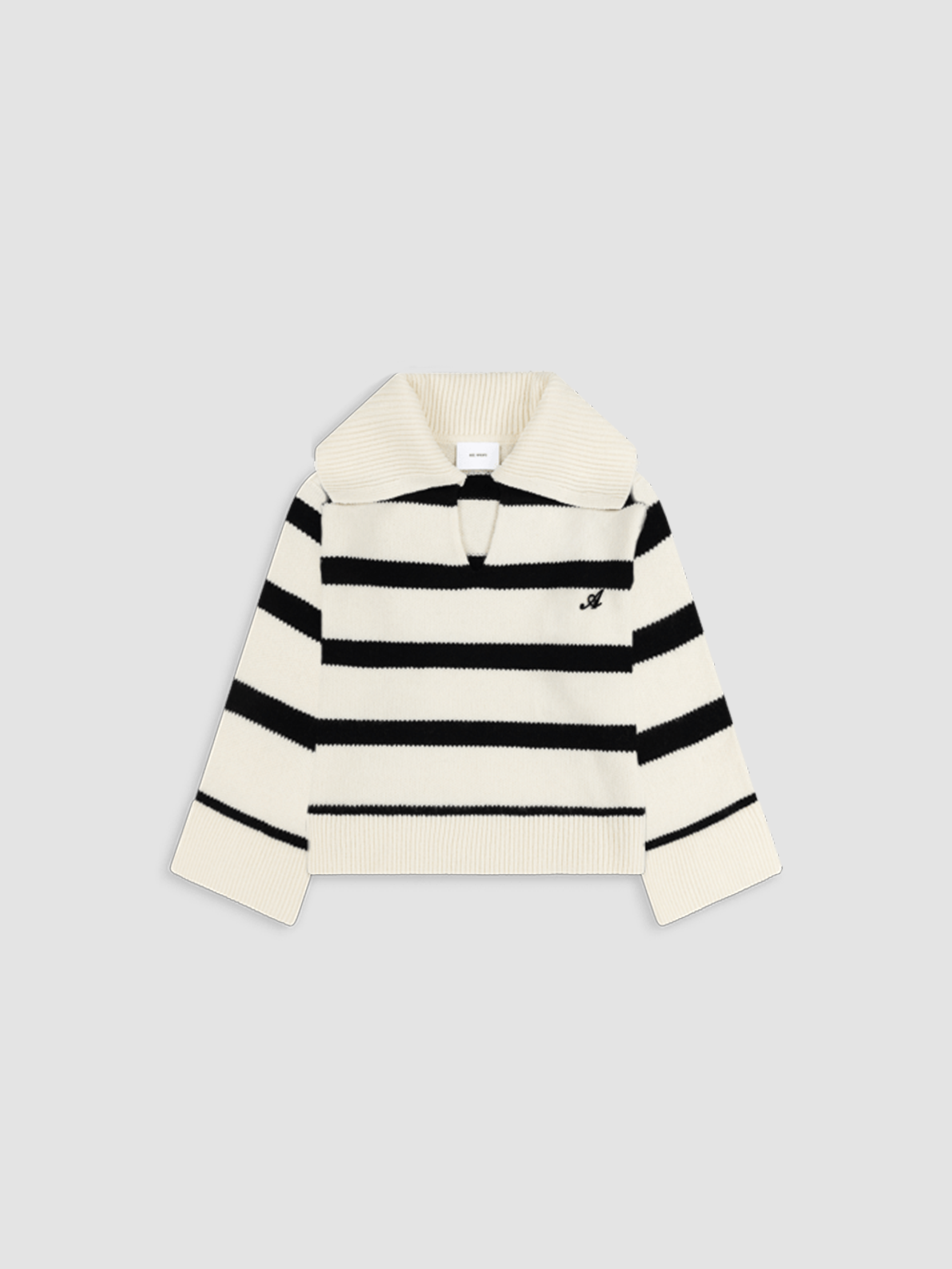 The Clio sweater is knitted from soft wool. Wide sleeves, an oversized collar and Signature A pin finish this piece.