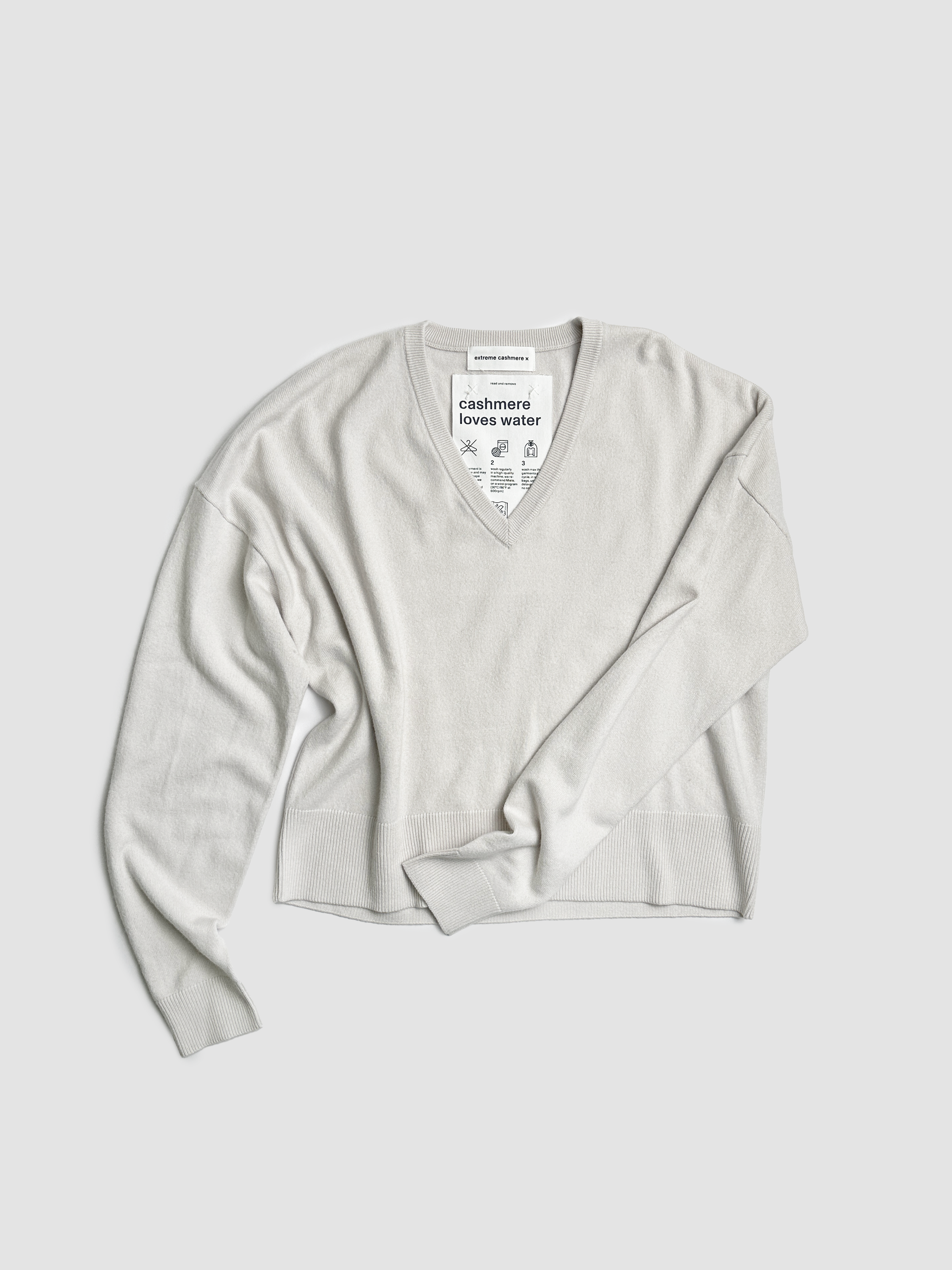 A wide v-neck cashmere sweater with ribbed hem and cuffs. The clash has a comfortable fit and is slightly cropped.