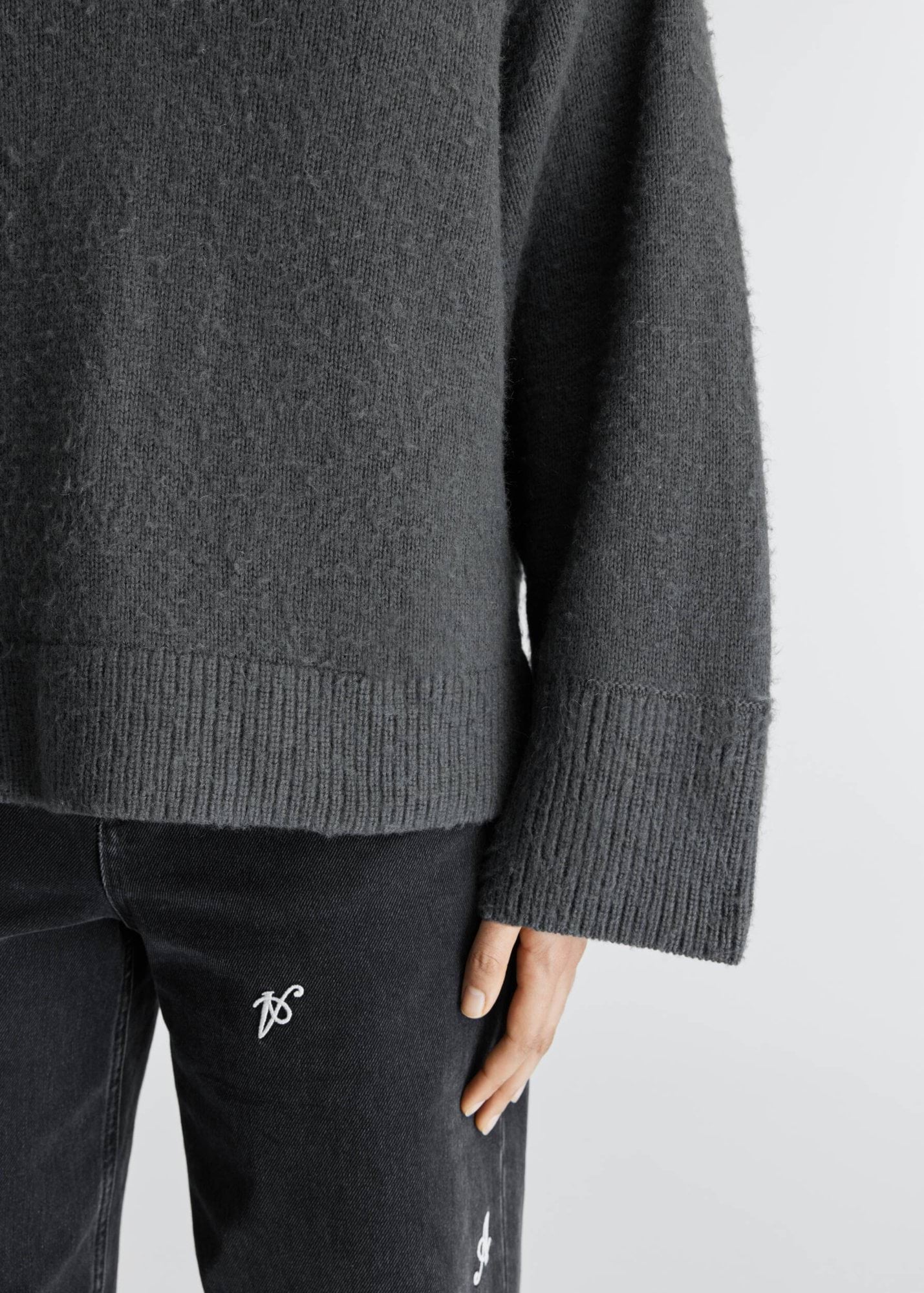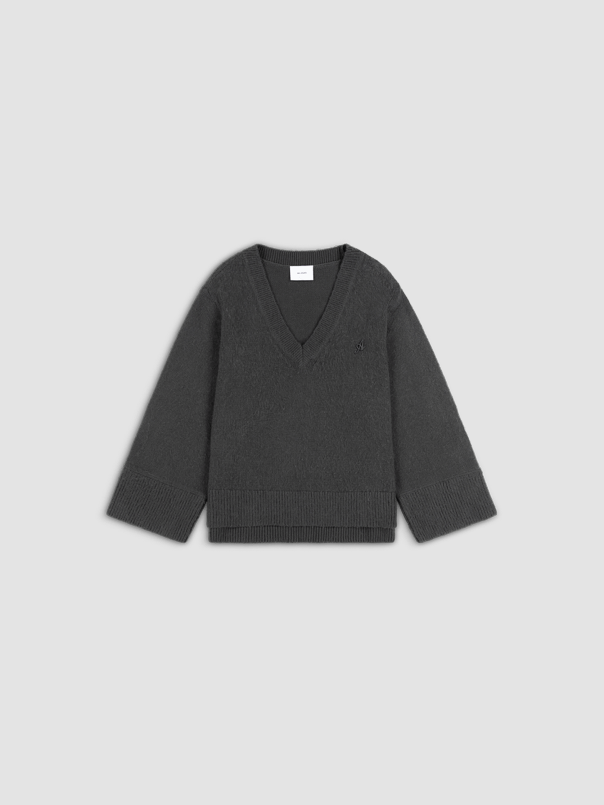 The V-neck Rain sweater is knitted from a soft blend of wool and cashmere that’s lightly distressed. Wide sleeves and a Signature A pin finish this piece.