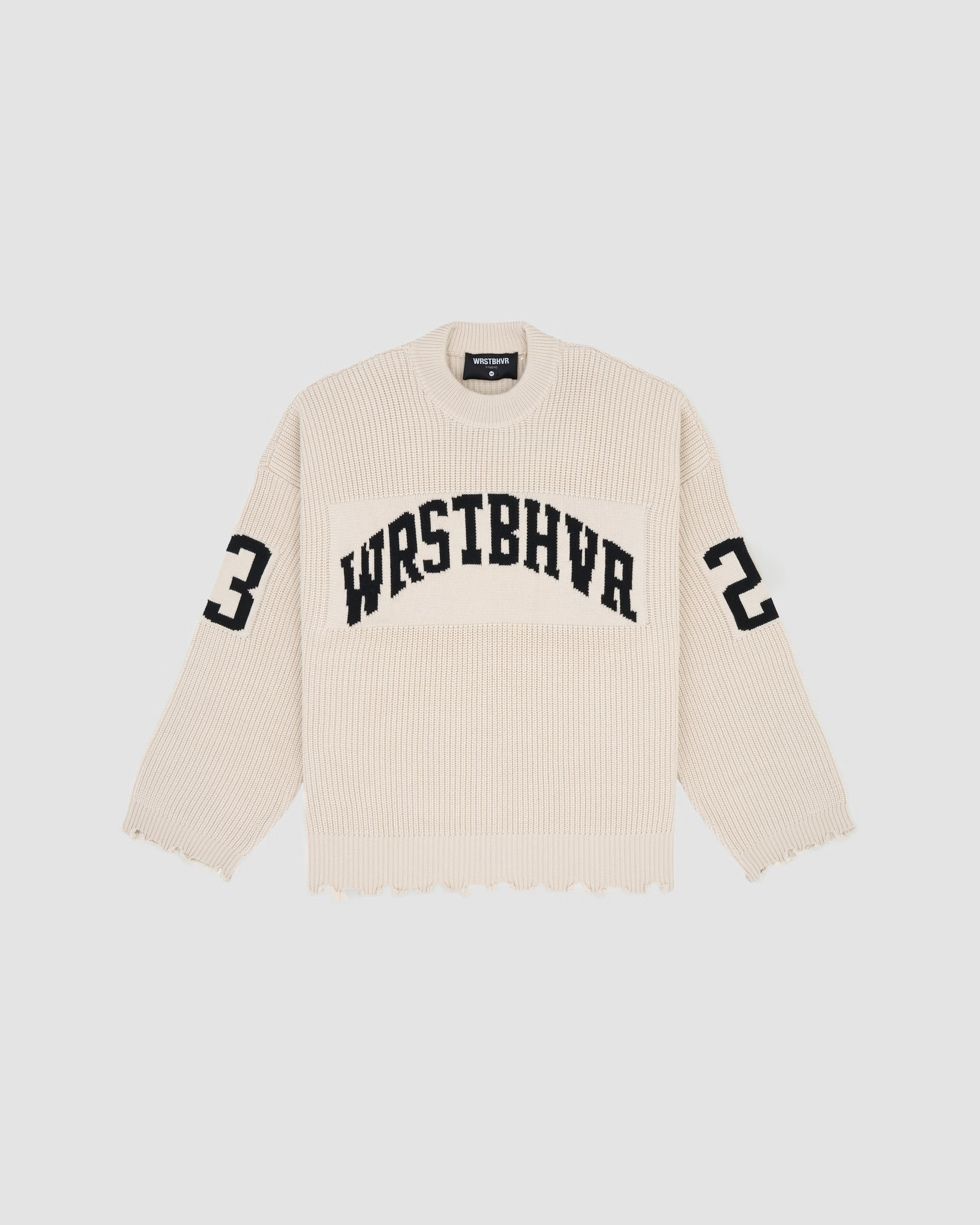 A stylish unisex knit sweater featuring a jacquard-knit logo and subtle distressed details for a modern, textured look. Perfect for layering or wearing on its own.