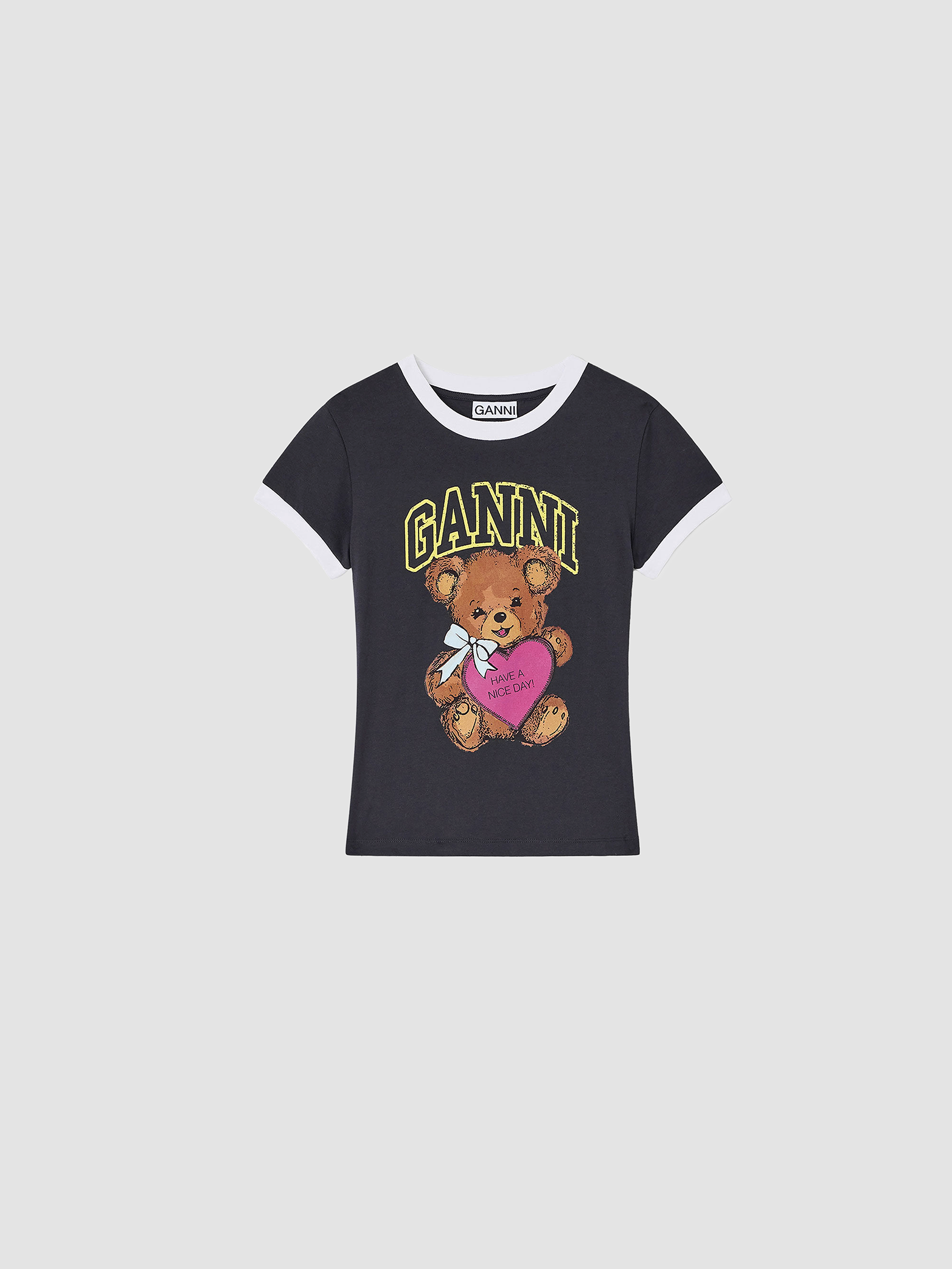 This T-shirt features a round neckline, short sleeves, and a GANNI logo. The T-shirt has a teddy print graphic and a 'Have a nice day! Please recycle' message.