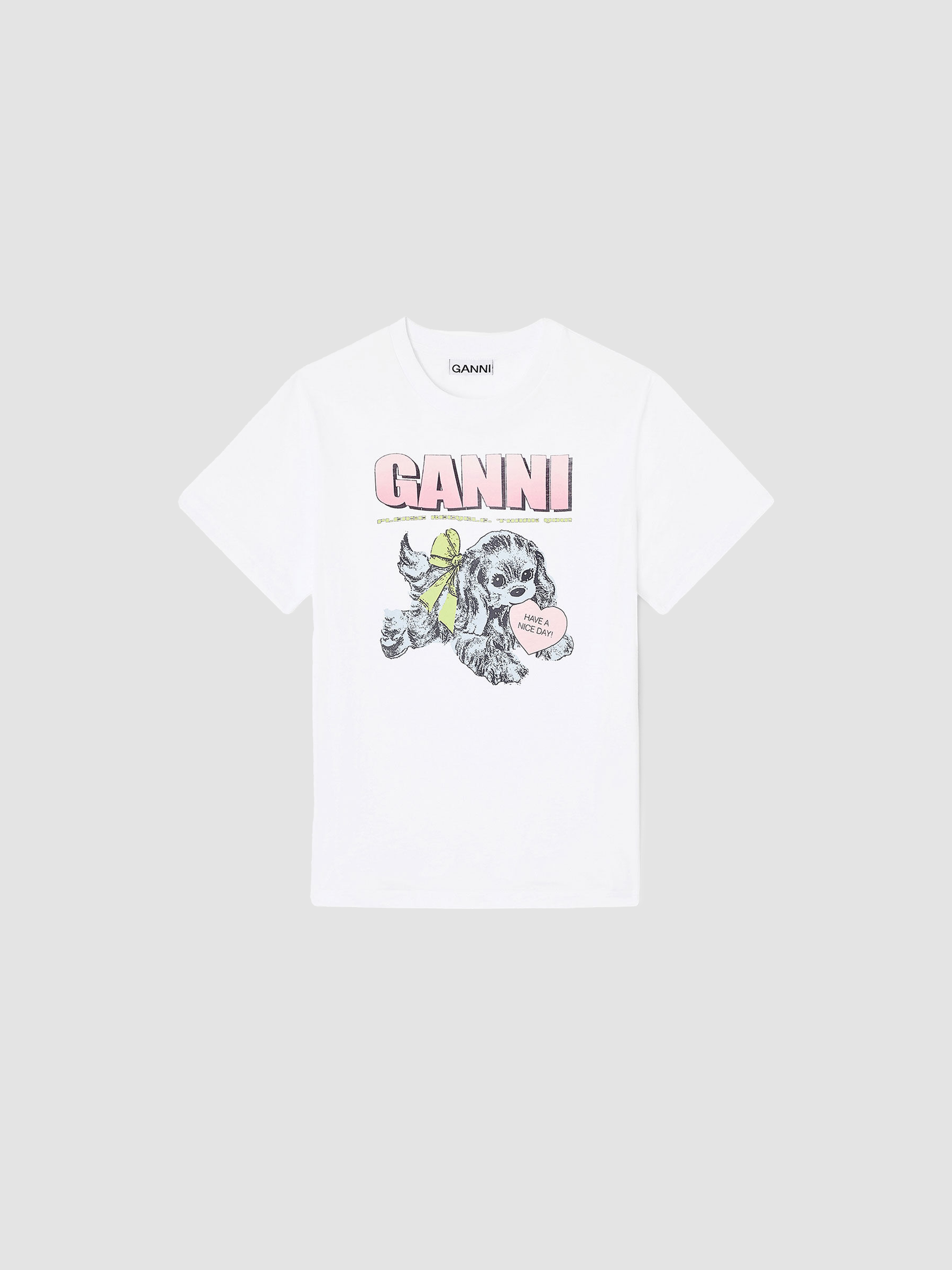 This T-shirt features a round neckline, short sleeves, and a GANNI logo. The T-shirt has a puppy print graphic and a 'Have a nice day! Please recycle' message.