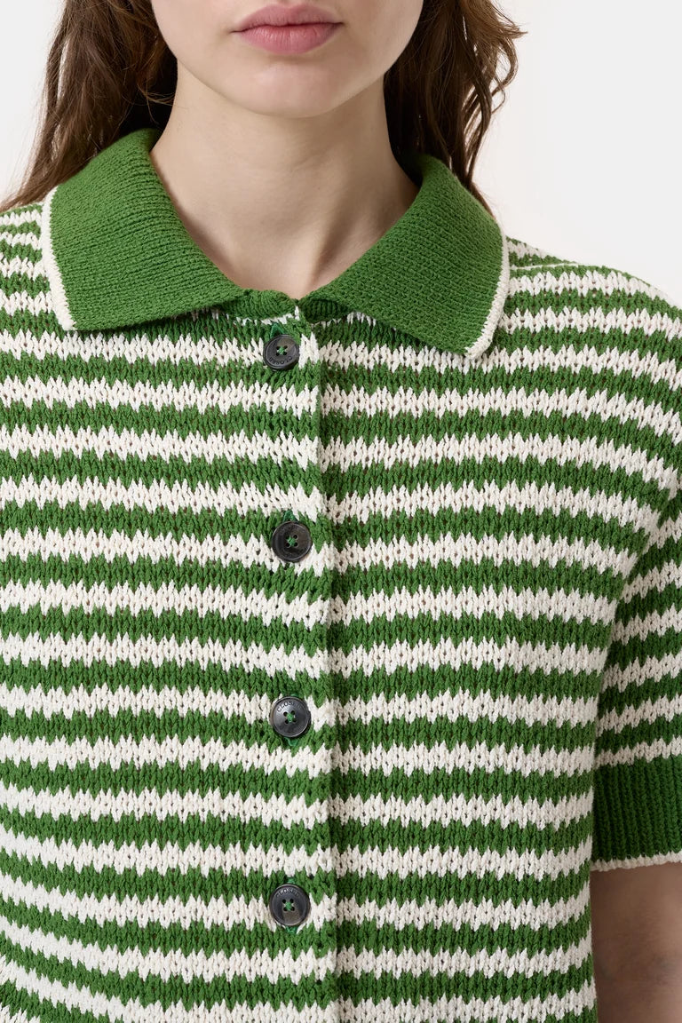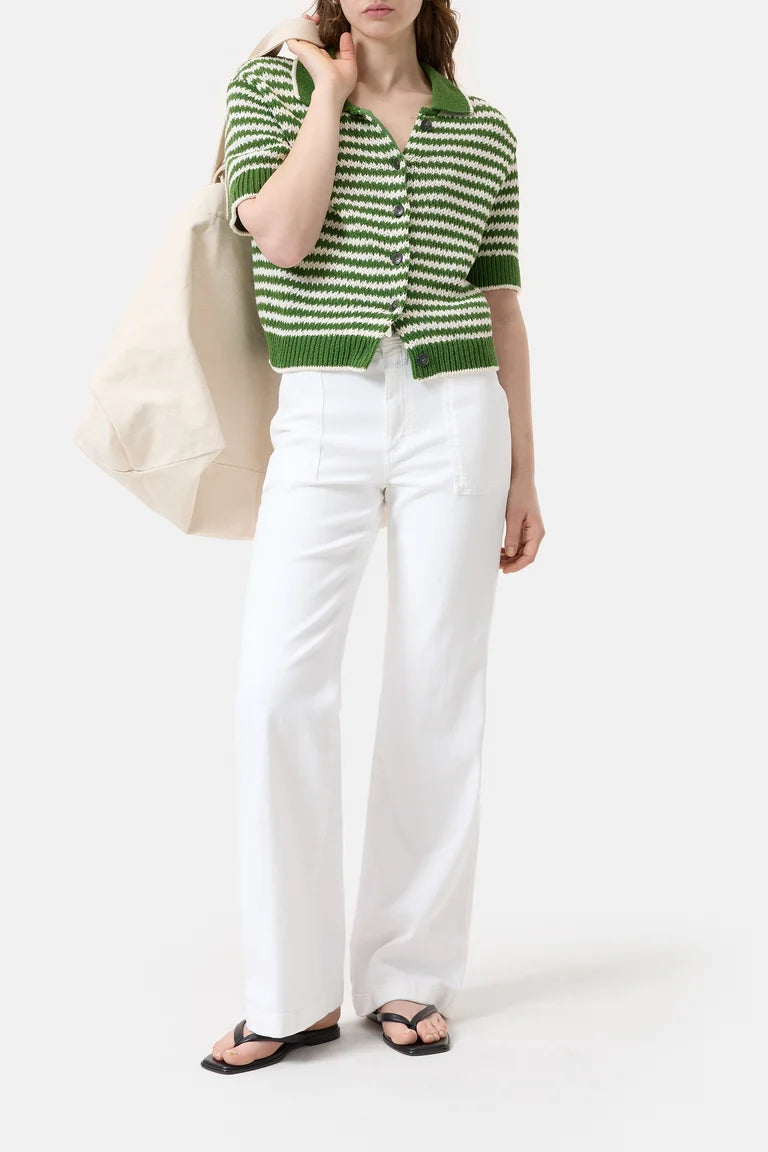 Made from Italian yarn in a chunky knit (3 gg): A short t-shirt cardigan in a slim fit and jagged two-tone stripe design. With a polo collar and ribbed cuffs at the hem. The yarn used is spun from pure organic cotton.