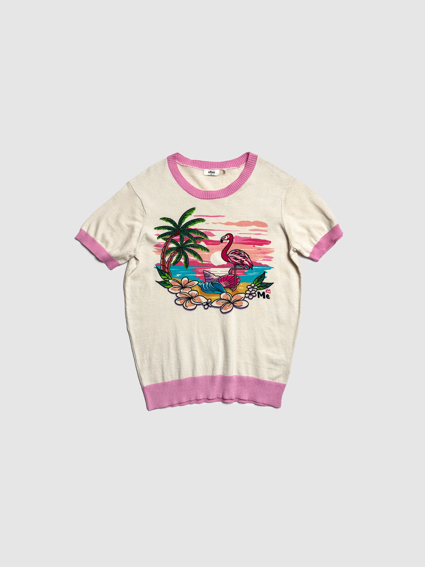 Short sleeve pullover t-shirt. T-shirt features a pretty tropical sunset complete with palm trees, flowers and a flamingo. All edges are in pink. Perfect for a vibrant, tropical look.