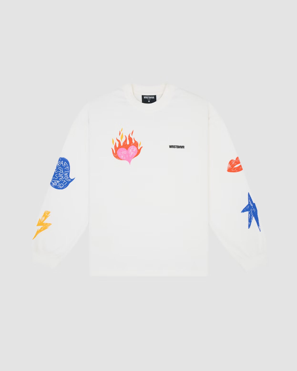 A comfortable unisex long sleeve T-shirt with a wide fit, perfect for everyday wear. Made from 300 GSM cotton for a soft and durable feel. Features prints on the front, back, and sleeves for a bold, eye-catching look.