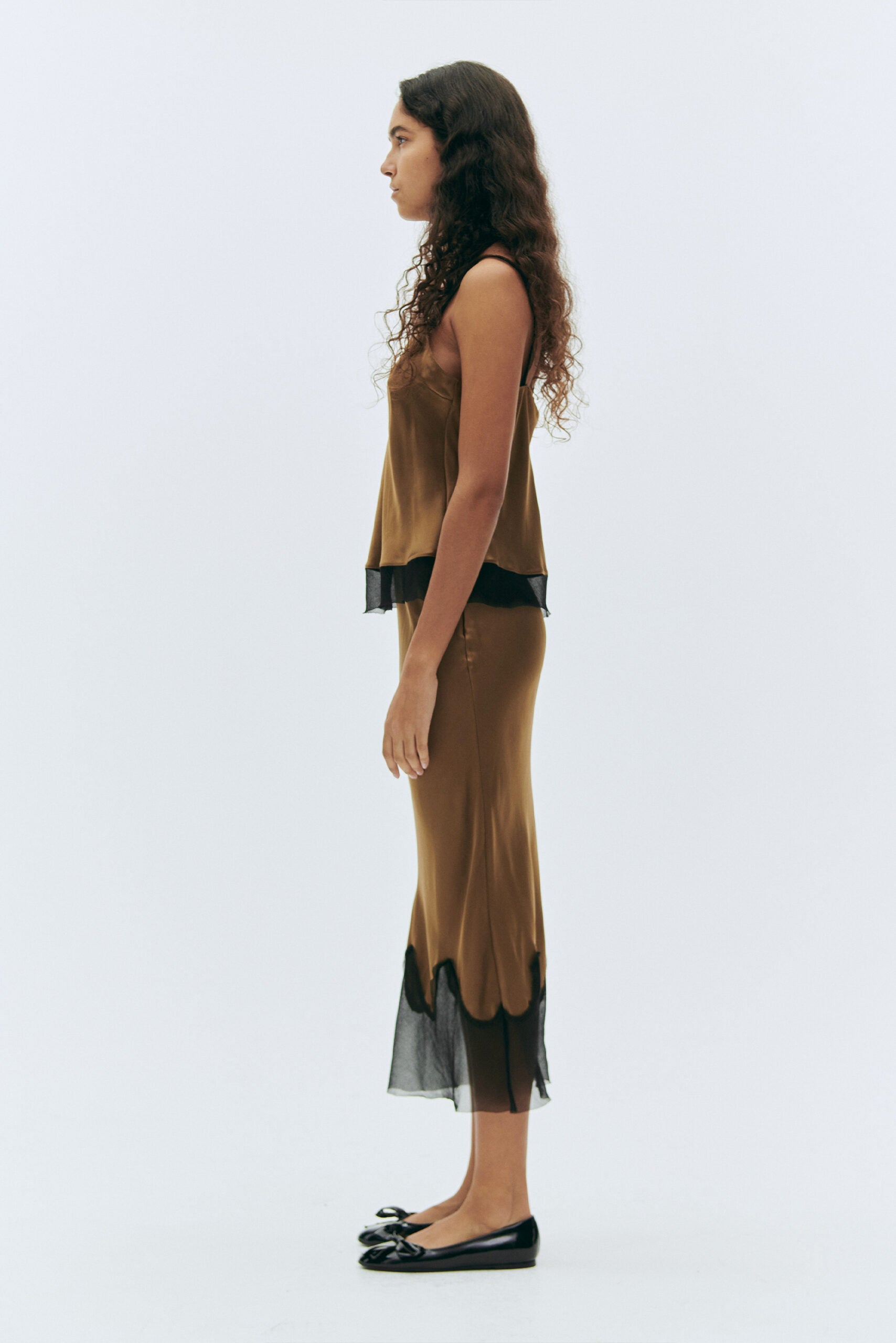 This light olive brown top features black detailing and a sleek silk feel, ensuring a classy look. Combine with Catania skirt for a complete look.