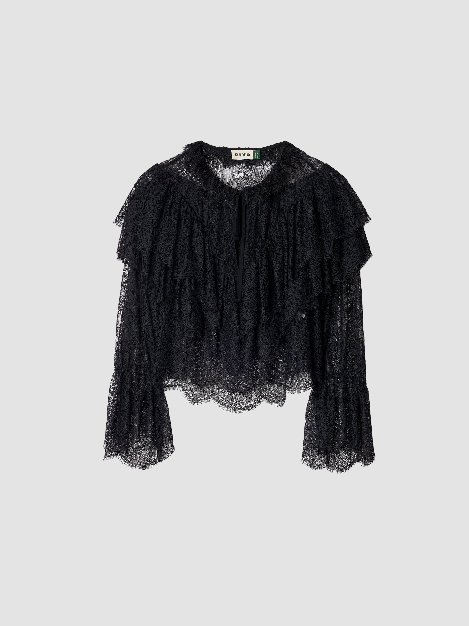 Faryn Top: a new classic inspired by true 1970s glam bohemia. Crafted from layers of delicate lace and ruffled hem detailing, it evokes a dark romanticism with theatrical flair. The cuffed sleeves create a beautiful billow in the sleeves, and the cropped fit makes it perfect for styling with your favourite RIXO skirts.