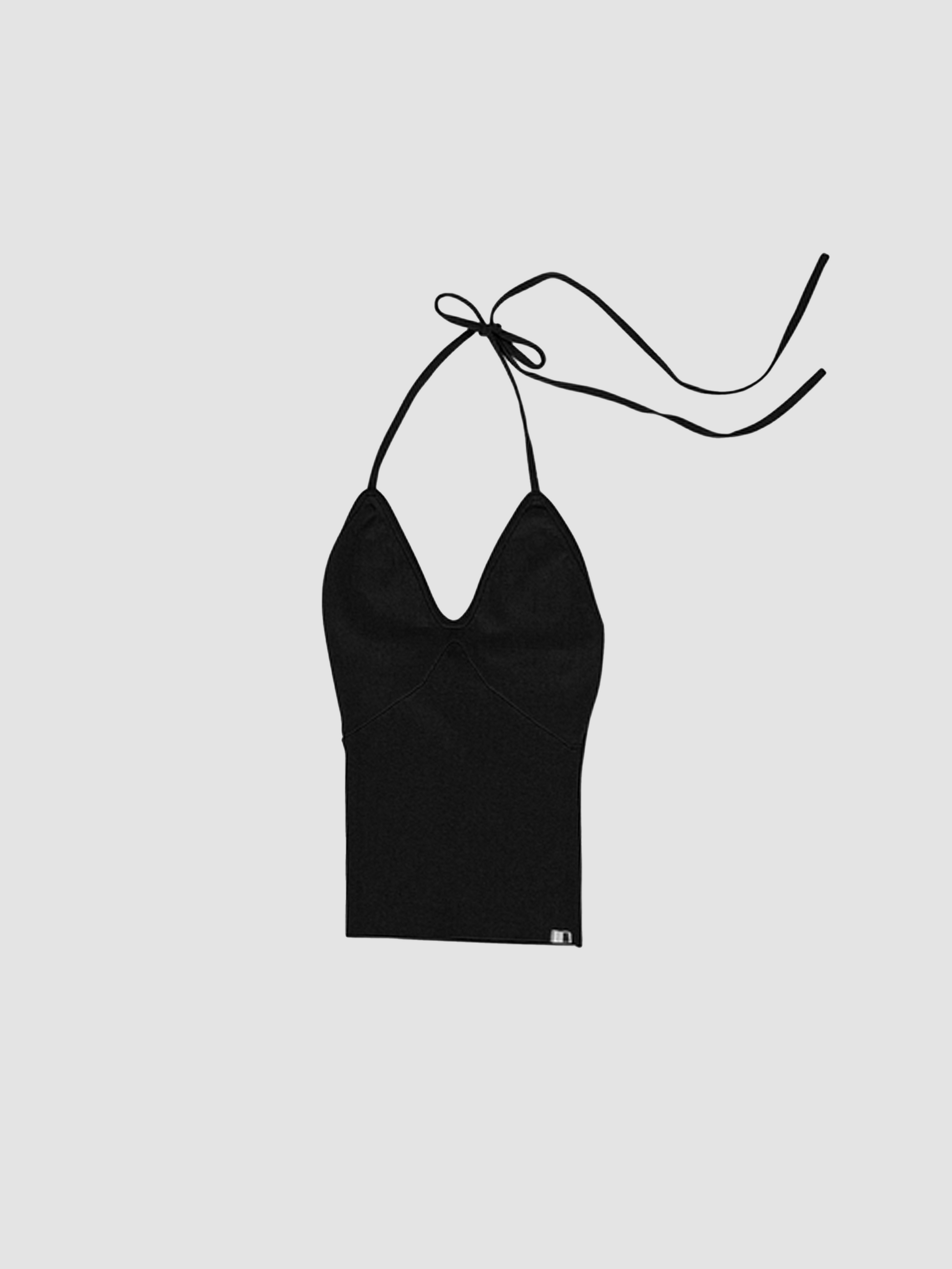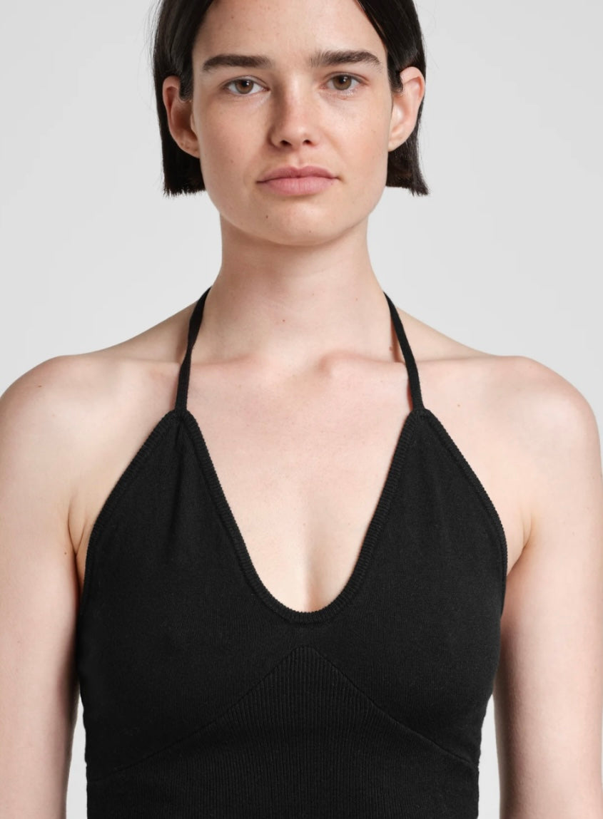 Cute, petite halter top with trompe l’œil bustier. Made in a comfortable cotton-cashmere mini rib. The fitted halter knit top is the perfect lightweight summer top.