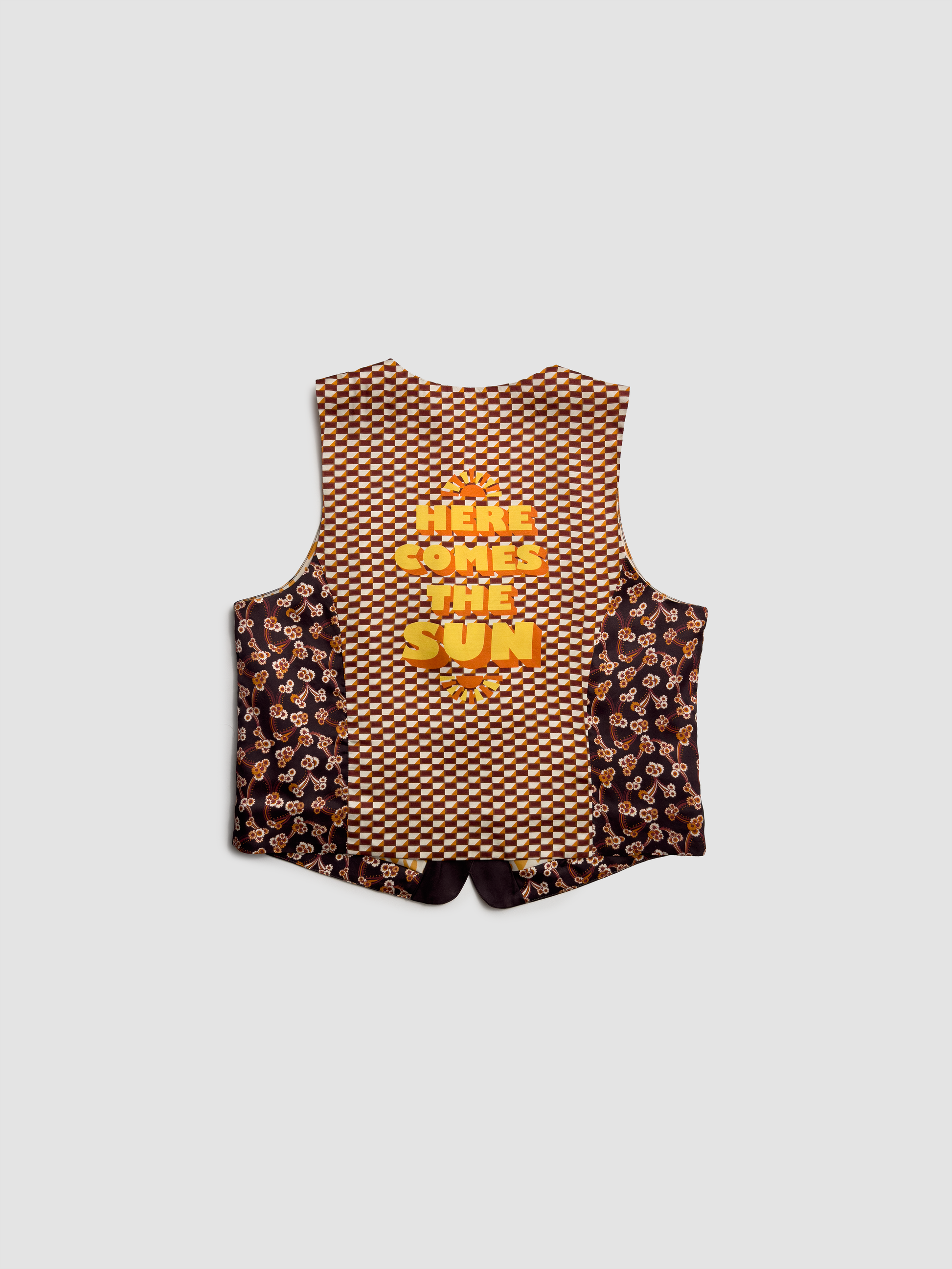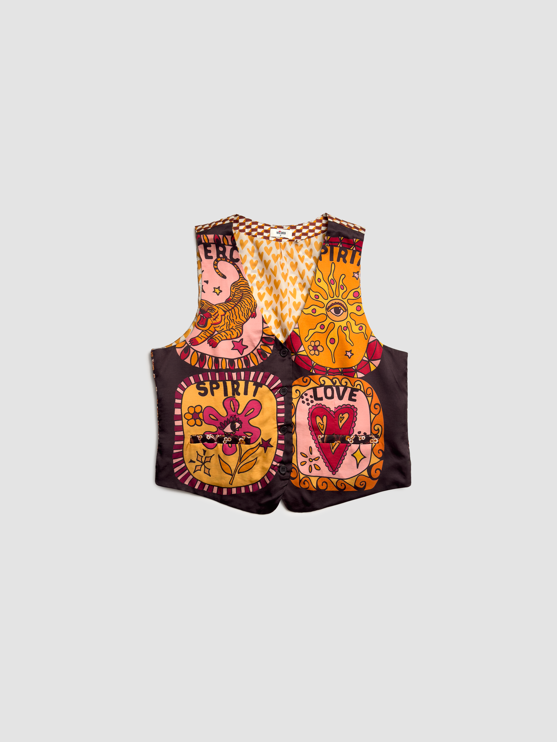 This adorable vest in Sunset print gives a 60’s vibe with four large graphics in front that read “FIERCE”, “SPIRIT” (2x) and “LOVE”. The graphics are of a tiger, a sun, a flower and a heart. Colors are predominantly pink, orange and purple. Deep V-neck with lining of small orange hearts. Back is small geometrics and reads in large letters, “HERE COMES THE SUN’’. Pair with Sunset Bailey pants for an eye-catching artistic look.