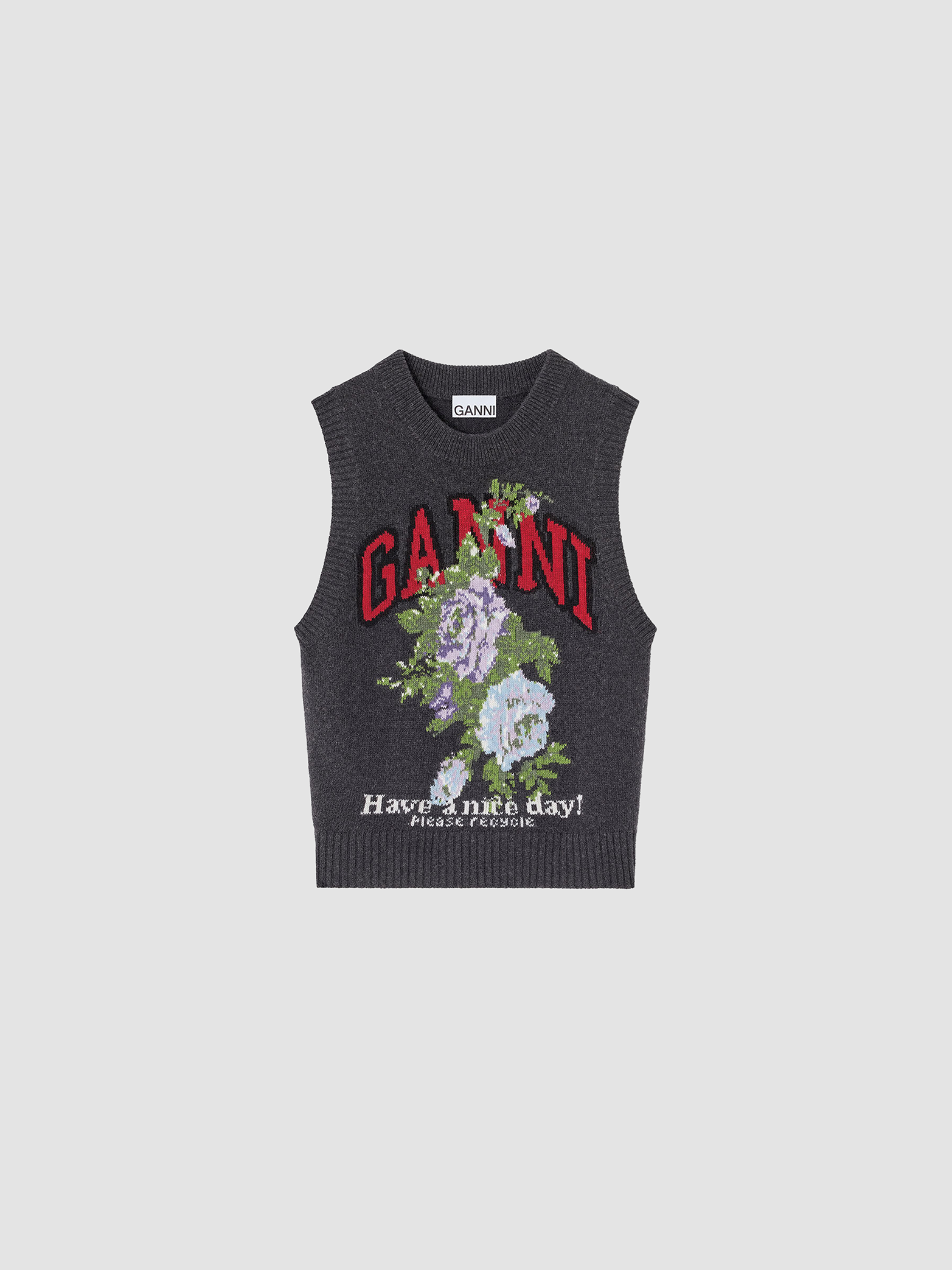 This wool vest features a round neckline, ribbed edges, a rose print graphic and a 'Have a nice day! Please recycle' message.